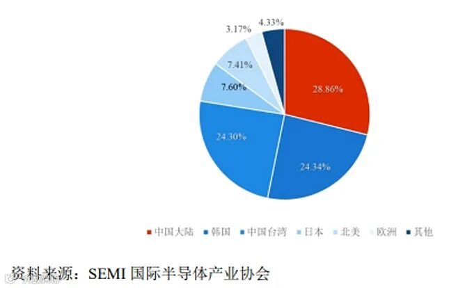 根据SEMI国际半导体产业协会数据,2021年全球半导体设备市场规模为1,026亿美元,同比增长44.10%;SEMI预测2022年全球半导体制造设备营收有望创下新高,达到1,175亿美元,同比增长14.7%。2021年中国大陆和中国台湾半导体设备规模分别为296.2亿美元和249.4亿美元,分别占全球市场的28.86%和24.30%,中国大陆连续两年成为全球半导体设备第一大市场,2021年全球半导体设备市场份额如下图所示: