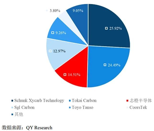 根据QY Research统计数据,2022年,CVD碳化硅零部件领域全球市场前五大厂商的市场份额合计超过60%,志橙半导体以3.57%的市场占有率跻身全球第八,为前十大厂商中唯一一个中国厂商。