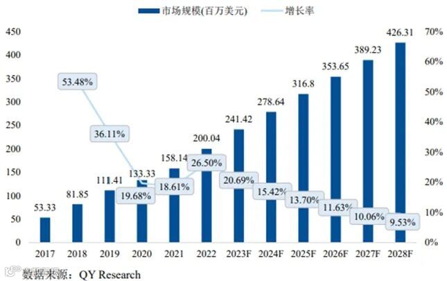 根据QY Research数据统计及预测,2022年中国CVD碳化硅零部件市场规模达到2.00亿美元,预计2028年将达到4.26亿美元,年复合增长率(CAGR)为13.44%。