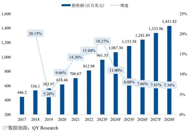 根据QY Research数据统计及预测,2022年全球CVD碳化硅零部件市场规模达到8.13亿美元,预计2028年将达到14.32亿美元,年复合增长率(CAGR)为9.89%。