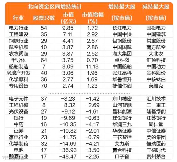 行业增仓方面,截至10月27日收盘的近5个交易日数据显示,电力行业被北向资金净买入金额最多,达到了9.85亿元,工程建设、钢铁行业分别排在第二、第三位,获增持金额为7.11亿元、4.41亿元,航空机场、农牧饲渔、半导体、船舶制造、房地产开发等行业增持金额相对靠前。酿酒行业本周遭净卖出48.47元,电池遭减持规模近37亿元,化学制药行业遭净卖出近15亿元,家电行业、证券、中药、银行等行业净卖出额规模靠前。
