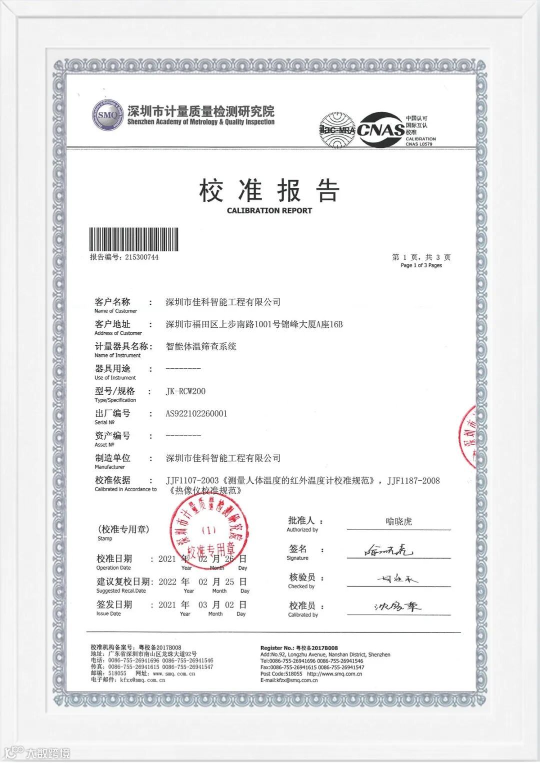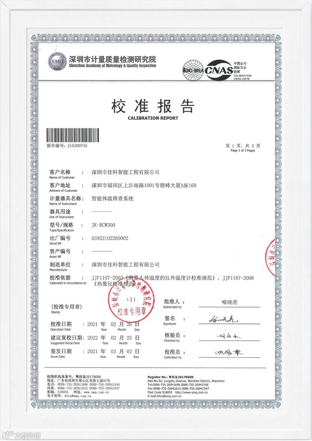 产品质量检验检测是产品质量安全监管的重要技术支持。近日,经过材料审查、送样检测等环节,佳科智能体温筛查系统JK-RCW200及JK-RCW300分别获得深圳市计量质量检测研究院颁发的检验检测机构资质认定证书,佳科智能体温筛查系统测温精度误差小于0.3℃。