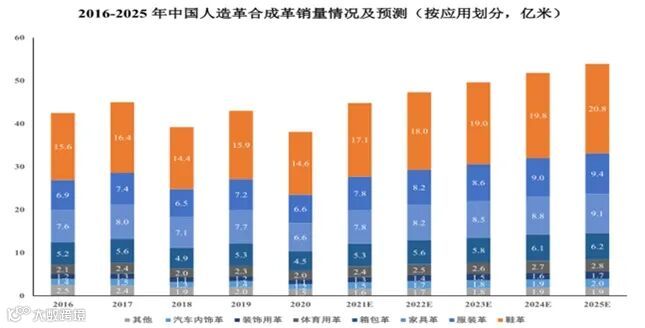 从产品分类来看,我国人造革合成革销量最大的应用领域为鞋革,2020年,我国销量达14.6亿米,占比38.3%;服装革、家具革、箱包革,分别占比17.3%、17.3%和11.8%。伴随未来我国人均可支配收入上升、消费升级等因素影响,预计2025年鞋革、服装革、家具革、箱包革销量将分别增长至20.8亿米、9.4亿米、9.1亿米、6.2亿米。