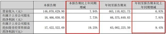 2022年第三季度,远信工业实现营业收入1.46亿元,同比增长7.94%;归属于上市公司股东的净利润1846.61万元,同比增长7.73%;归属于上市公司股东的扣除非经常性损益的净利润1742.25万元,同比增长19.25%。