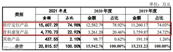 报告期各期,科莱瑞迪的主营业务主要为放疗定位产品与骨科康复产品。这两项主营业务产品收入占公司主营业务收入的比例分别为98.74%、99.38%和97.90%,为公司主要收入来源。