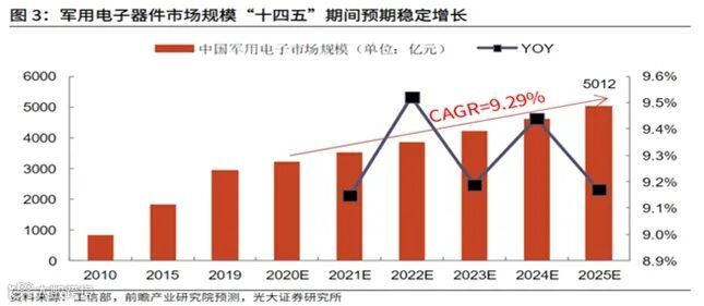 按照“十四五”期间的规划,预计到2025年,我国军用电子市场规模或可突破5000亿元,军用电子器件内生和外延都将同步增长,这是一个巨大的增值增量市场,前景预期非常广阔。