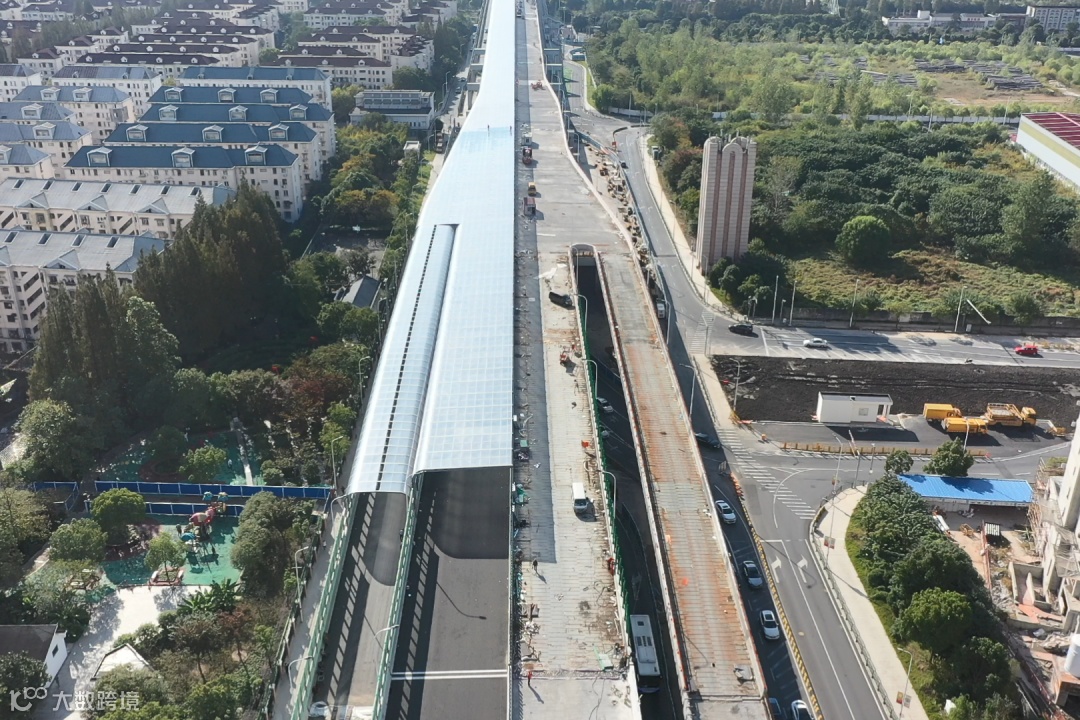 ▲鸟瞰建设中的济阳路高架实景(二)