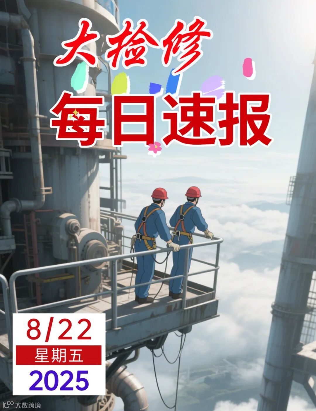 合洗厂大检修计划检修3套装置,停工交检修3套、检修中3套。检修项目127项,已开工55项(开工率43%)。压力容器(球罐)完成检验21台,容器检测(非球罐)完成57台,工业管道检测完成373条,常压储罐清洗完成5台,机泵完成修理6台。石油二厂挥发性有机物提标改造治理项目:计划8月22日,罐体搭设脚手架,8月25日开始进行加热盘管维修及储罐罐体开孔作业。