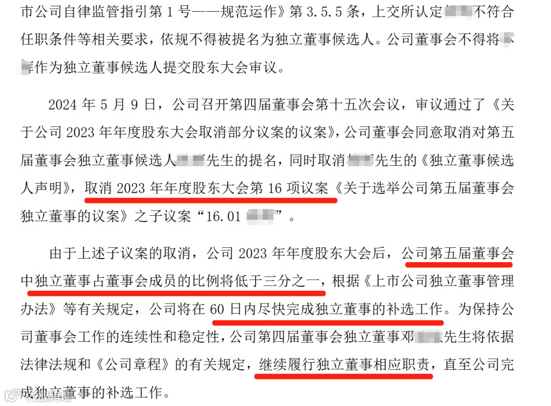 ▶3、指定原独立董事继续履职并尽快改选:取消独立董事候选人A的提案,暂时指定原独立董事C继续履职,尽快完成改选工作,并发布股东会补充通知。