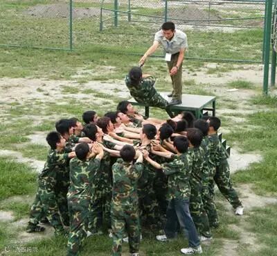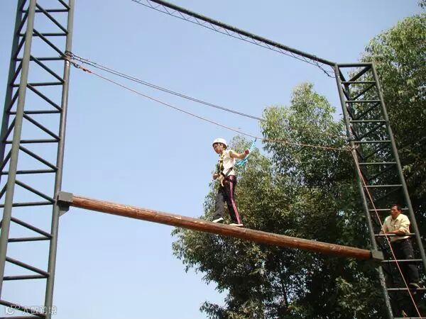 目的:直径大于20公分的六根木桩成梯状悬于12米高空,最低一根距地约1.2米,且间距自下而上逐渐增大,小组成员被随机分为2人一组,相互配合,共同登顶