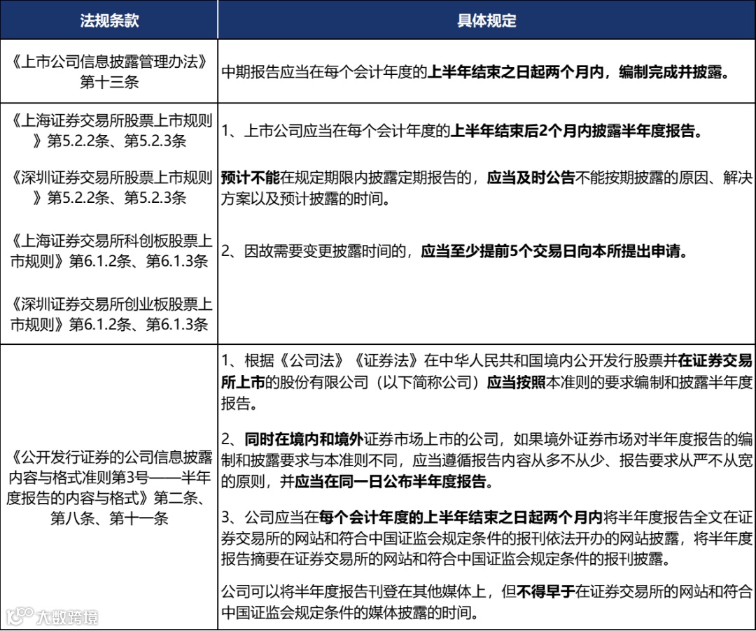 1.上市公司应当在每个会计年度的上半年结束之日起两个月内披露半年度报告,对于同时在境内外上市的主体,应当在同一日公布半年度报告,且公司半年度报告在其他媒体的披露时间不得早于在证券交易所的网站和符合中国证监会规定条件的报刊依法开办的网站披露的时间。
