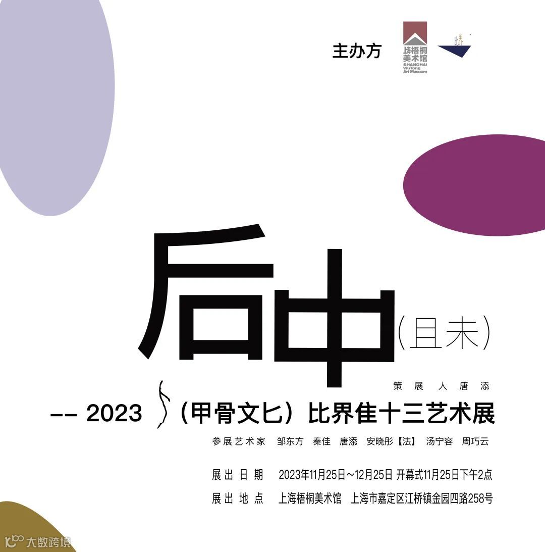 2023年11月25日下午2点,由上海梧桐美术馆和上海比界文化传播有限公司共同主办的《后中(且未)-- 2023 (甲骨文匕)比界隹十三艺术展》即将开幕!展览地点在上海市嘉定区江桥镇金园四路 258 号上海梧桐美术馆,展览日期为2023 年 11 月 25 日至 12 月 25 日。展览由邹东方、秦佳、汤宁容、周巧云、安晓彤和唐添6位艺术家共同举办。展览具有很强的专业性,展出的原创作品具有很高的艺术造诣,呈现了艺术领域的最新探索和成果。展览旨在通过艺术的方式实证“半边天”中国人,探讨并展现"后中"这一主题,展示人类命运共同体-“半边天“中国人的视角。