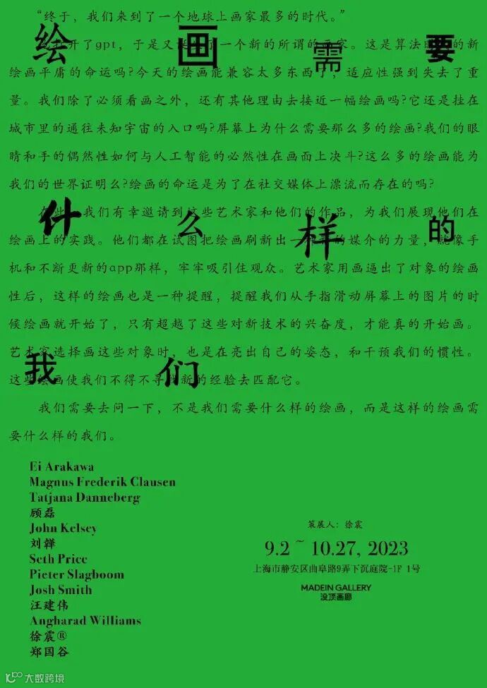 没顶画廊于2023年9月2日推出群展“绘画需要什么样的我们”。展览由徐震策划,邀请来自全球的13位艺术家,呈现数十件深具实验性和前瞻性的绘画。这些作品共同追问绘画如何可能在算法和后观念的双重语境中刷新其媒介力量,并促使我们思考怎样重塑自身经验,才得以持续地想象、创造、观看新的绘画。