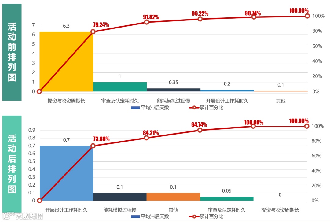 对比活动前、后平均滞后天数排列图可知,“提资与收资周期长”不再为主要问题,超低能耗专项设计方案周期得到显著缩短,小组活动措施效果显著。
