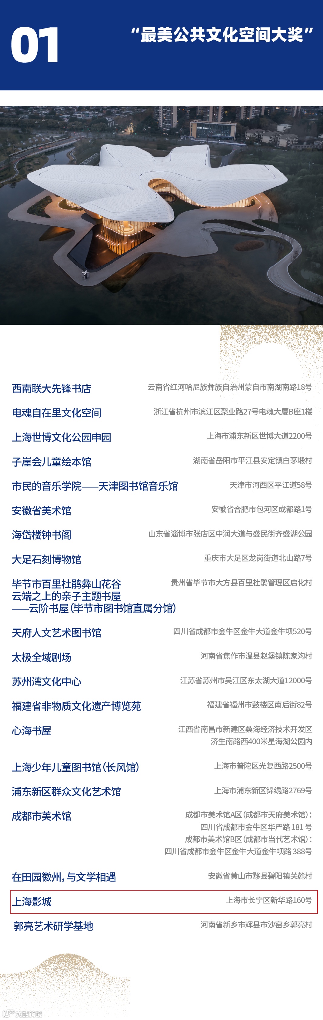 由上海市文化和旅游局、上海市浦东新区人民政府主办的2023年长三角及全国部分省市最美公共文化空间大赛,经过专家初评、复评和终评,最终产生了“最美公共文化空间大奖20个“百佳公共文化空间奖”109个“优秀公共文化空间案例奖”212个、年度十佳设计师/机构奖”10个,“优香运营奖”15个。昨日,2023年大赛获奖名单正式揭晓!公司上海影城项目成功入选,获评“最美公共文化空间大奖”。