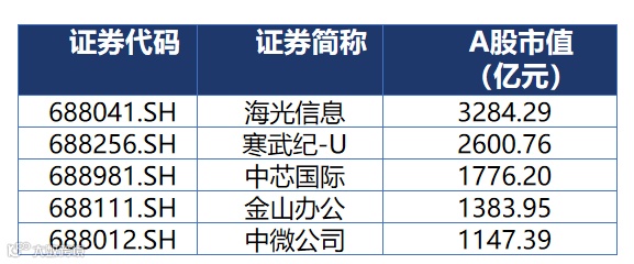 科创板公司A股市值前五名