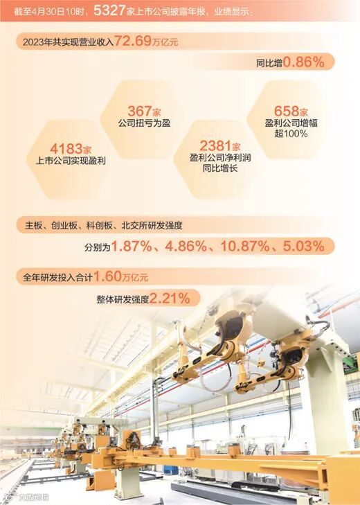近日,上市公司2023年度成绩单出炉。据中国上市公司协会统计,截至4月30日10时,沪、深、北三家证券交易所已有5327家上市公司公布2023年年度报告。透过数据看发展,过去一年,上市公司整体业绩持续修复,内生发展动能不断集聚,回报投资者能力稳步提升。记者走进上市公司、采访相关专家,感知这份成绩单背后的高质量发展新步伐。