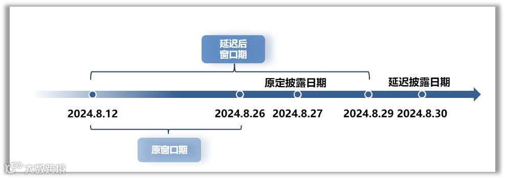 例如:半年报原定披露时间为2024.8.27,本次将披露时间延迟至2024.8.30,则延迟后的窗口期时间为:2024.8.12至2024.8.29。(北交所为:2024.8.12至2024.8.30)。