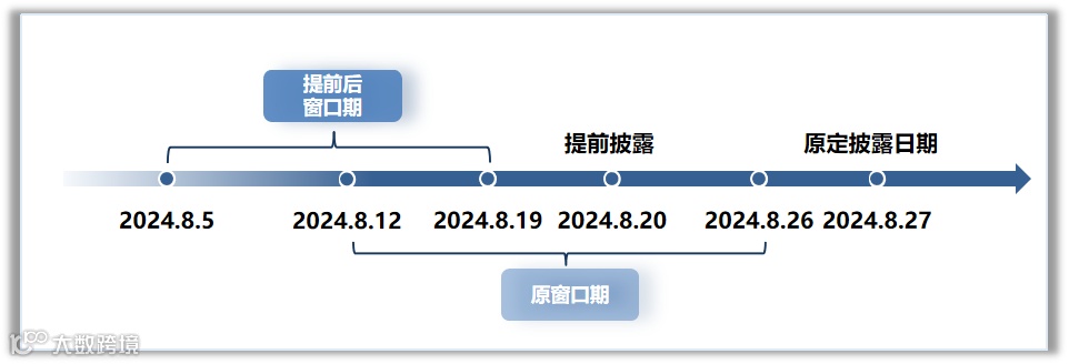 半年报原定披露时间为2024.8.27,现将披露时间提前至2024.8.20,则提前后的窗口期时间为:2024.8.5至2024.8.19。