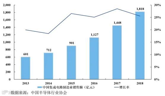中国大陆晶圆代工行业起步较晚,但发展速度较快。根据中国半导体行业协会统计,2018 年中国集成电路产业制造业实现销售额 1,818 亿元人民币,同比增长 25.55%,相较于 2013 年的 601 亿元人民币,复合增长率达 24.78%,实现高速稳定增长。