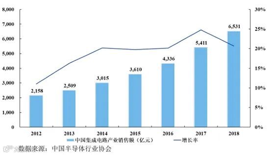 根据中国半导体行业协会统计,中国集成电路产业销售额由 2012 年的 2,158亿元增长至 2018 年的 6,531 亿元,年均复合增长率达 20.27%。其中,2016 年、2017年及 2018年中国集成电路产业销售额分别为 4,336亿元、5,411亿元及 6,531亿元,增速分别达 20%、25%及 21%。