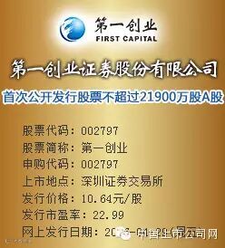 第一创业此次发行总数为21900万股,网上发行6570万股,发行市盈率22.99倍,申购代码:002797,申购价格:10.64元,单一帐户申购上限65500股,申购数量500股整数倍。