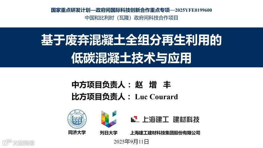 近日,由中方单位同济大学、上海建工建材科技集团股份有限公司与外方单位比利时列日大学联合承担的国家重点研发计划“政府间国际科技创新合作”重点专项“基于废弃混凝土全组分再生利用的低碳混凝土技术与应用”项目启动会暨实施方案论证会在上海顺利召开。