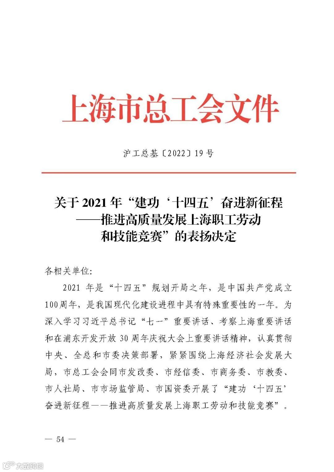 近日,市总工会召开2022年加快经济恢复和重振暨“建功‘十四五’ 奋进新征程”上海职工劳动和技能竞赛推进会,并在会上命名了2021年“上海工匠”,表彰了2021年上海职工劳动和技能竞赛获奖集体。建设咨询成功获评“上海职工劳动和技能竞赛三等奖”。