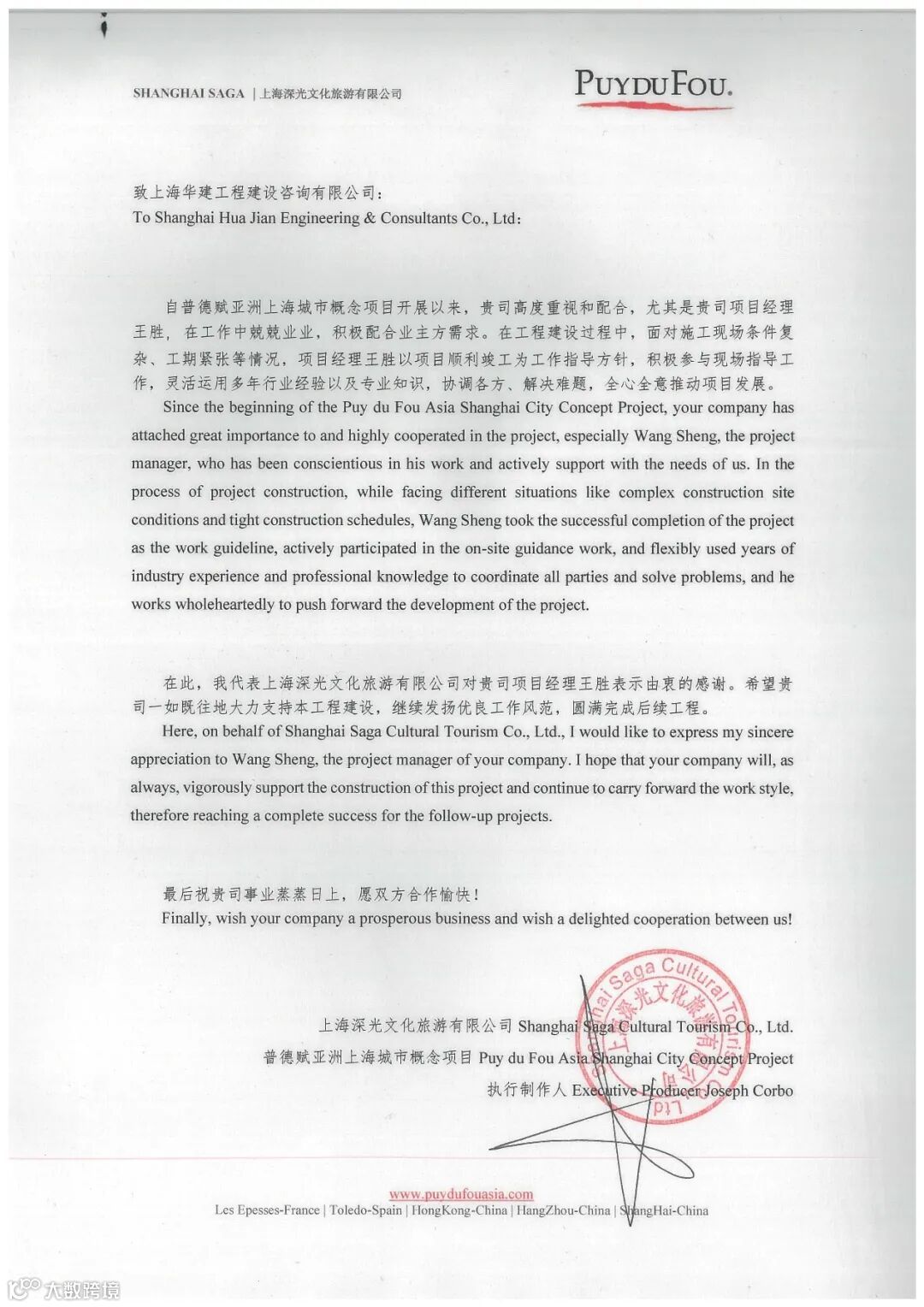 时值春节假期,建设咨询收到了来自上海深光文化旅游有限公司与普德赋亚洲上海城市概念项目发来的感谢信。信中业主对公司的工作态度和专业程度给予了高度评价,并对项目经理——综合设计二所结构组长王胜同志兢兢业业的工作作风、积极配合的工作态度给予了肯定。