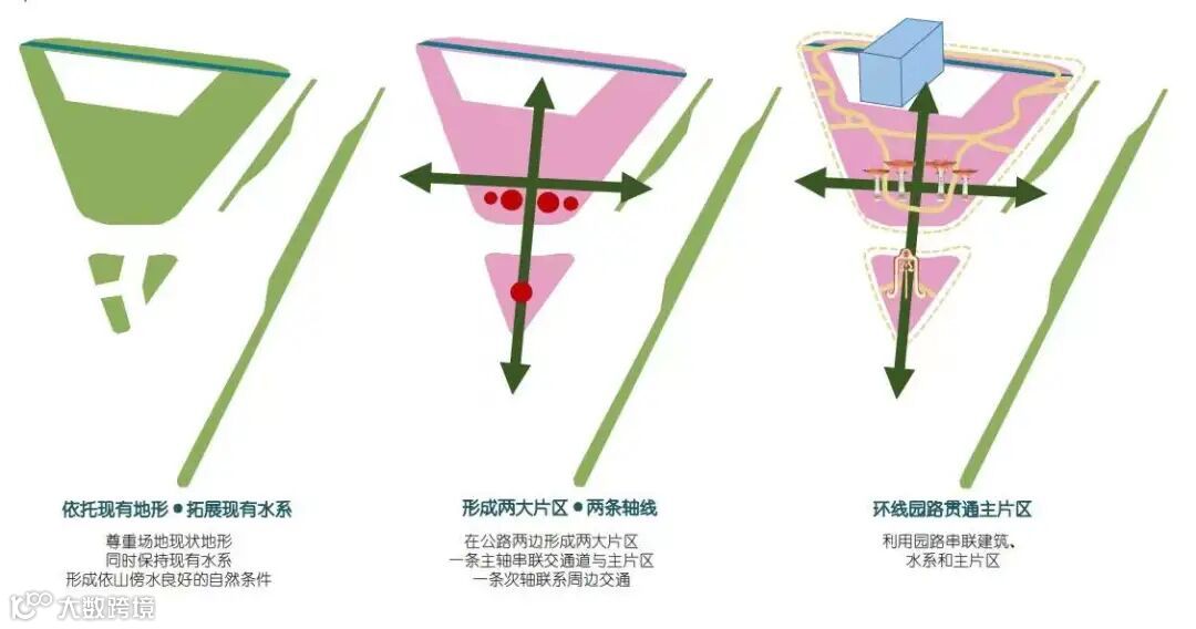 设计依托现有地形,尊重场地现状地形,同时保持现有水系,形成依山傍水良好的自然条件。并从确山朗陵文化、山水文化、建筑特征中寻找灵感,将地块分为两大片区,划定两大轴线,一条主轴串联交通道与主片区,一条次轴联系周边交通,利用园路串联建筑、水系和主片区。以中轴景观带动也创造出形象突出、舞动多彩的丰富空间形式。