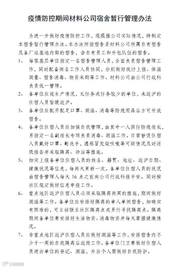 员工宿舍内绝大多数人员来自外省市,部分来自于重点疫情地区,公司制定《疫情防控期间材料公司宿舍暂行管理办法》,做好饮食、消毒、消防等各项措施,分批次对返沪人员进行单独隔离并每日上报统计身体健康状况,切实保障返沪员工安全。