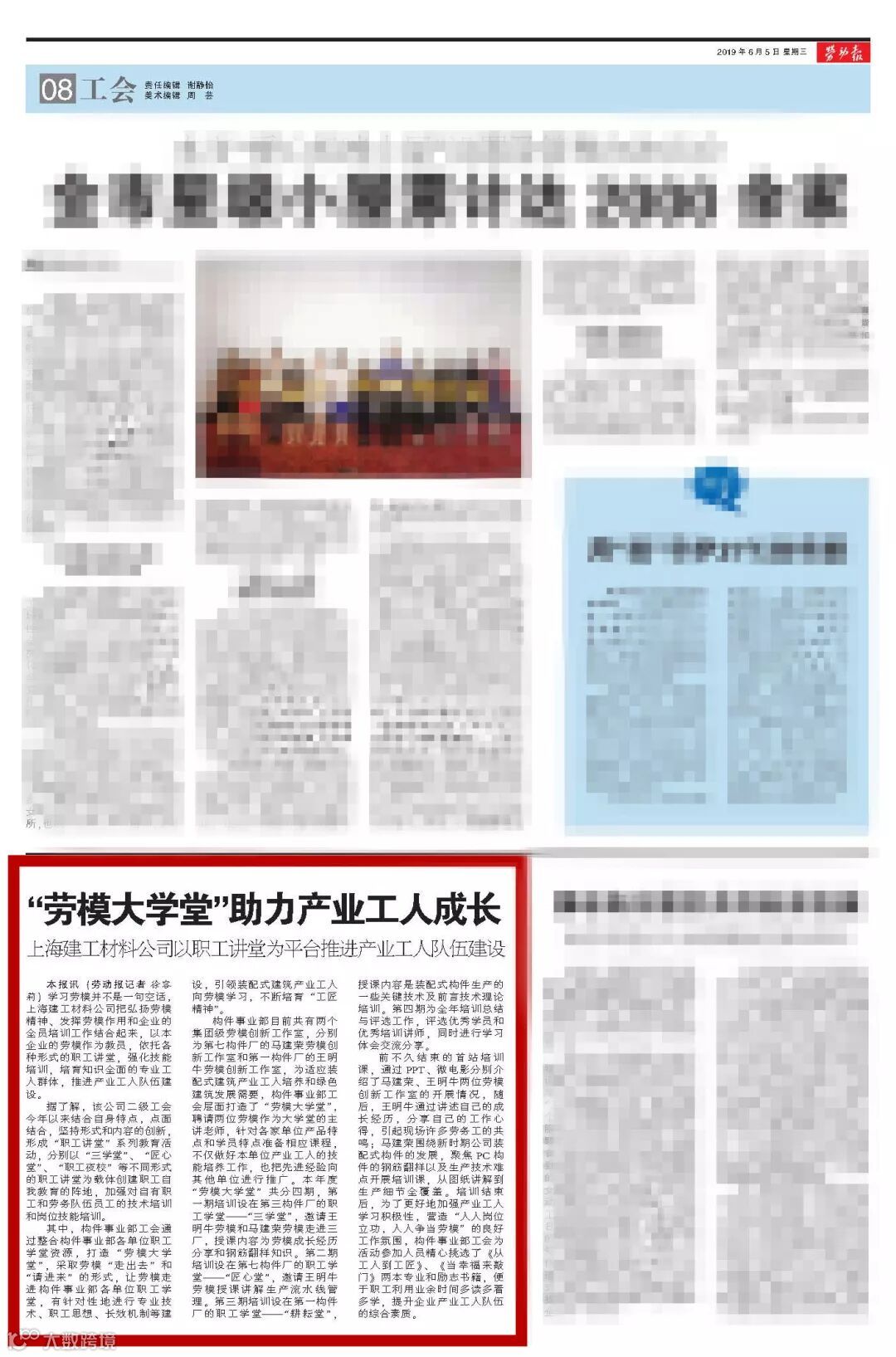 6月5日,《劳动报》上刊载了一篇名为《“劳模大学堂”助力产业工人成长》的文章,详细介绍了公司工会以职工讲堂为平台,打造“劳模大学堂”推进产业工人队伍建设。