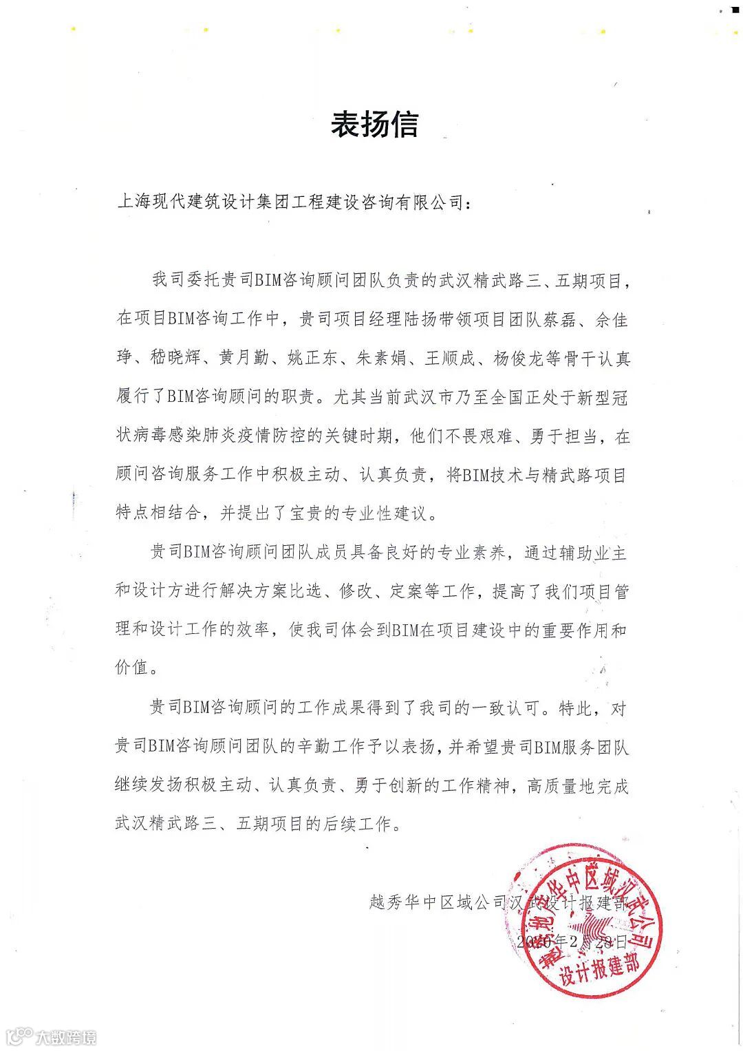 近日,公司收到了来自越秀地产华中区域武汉公司的一封表扬信。