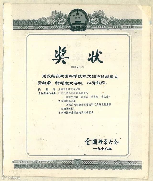 70-80年代,在上海体育馆建设中,用于泳池水温调节的3000吨蓄冷水池和相关制冰设备,以及自动计时、计分设备和技术的运用全国领先,在1978年第一届全国科技大会上,“上海体育馆大跨度网架整体提升技术”得到了表扬奖。成功设计了上海市第一个自动化大型太阳能装置并安装于外滩原市政府大厦屋顶,受到全市乃至全国关注。