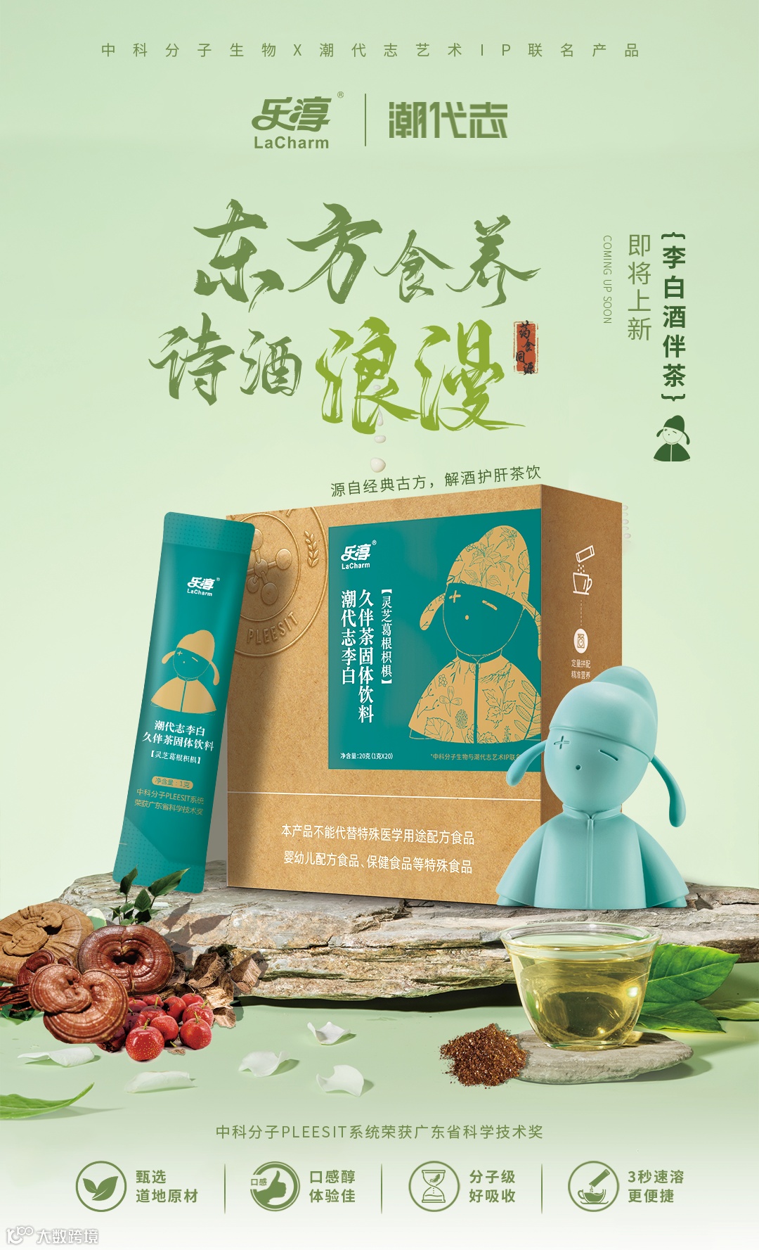 2023年11月,中科分子生物与21造艺术家黄海军的“潮代志李白”艺术IP展开了合作,即将共同推出一款解酒护肝的新式茶饮——乐淳潮代志李白久伴茶。