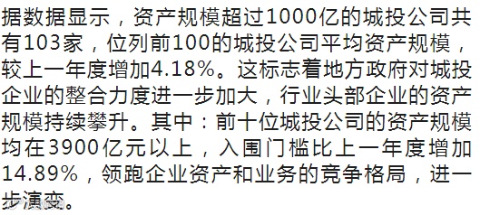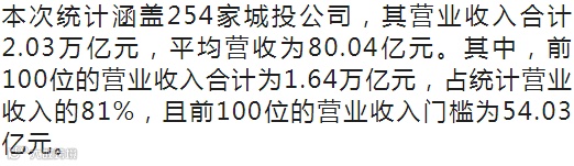 数据显示,254家城投公司的总资产合计28.93万亿元,平均每家城投公司的资产为1139.04亿元,较上一年度的1120.99亿元,增幅为1.61%。其中,前100位城投公司,总资产规模达20.97万亿元,占统计总资产的72%。前100位的总资产门槛为1008.37亿元,较上一年度的980.59亿元,增幅为2.83%。