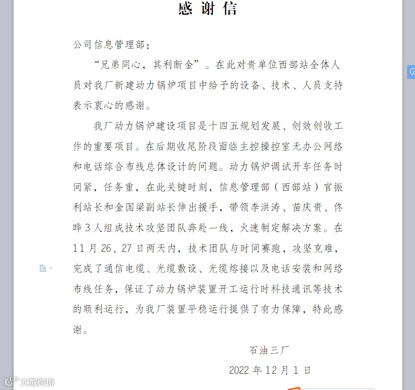 信息管理部西部信息站了解情况后,以高度的政治责任感和紧迫感,由站领导带队,第一时间组织5名骨干力量制定解决方案,利用11月26、27日两天周末休息时间,与时间赛跑,攻坚克难,完成了石油三厂动力锅炉建设项目通信电缆、光缆敷设、光缆熔接以及电话安装和网络布线任务,保证了动力锅炉装置调试开车前网络通讯等信息化设施同时投用,为石油三厂动力锅炉装置平稳运行提供了信息技术保障。石油三厂随后写了一封感谢信,对在此项工作中信息管理部给与的设备、技术、人员支持表示感谢。