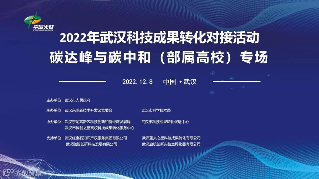 12月8日下午,由武汉市人民政府主办,武汉东湖新技术开发区管委会、武汉市科学技术局承办,东湖高新区科技创新和新经济发展局、武汉市科技成果转化促进中心、武汉市科创之星高校科技成果转化服务中心协办,武汉启航创新实验室孵化器有限公司支持的“2022年武汉科技成果转化对接活动·碳达峰与碳中和(部属高校)专场”在武汉光谷科技会展中心举行。