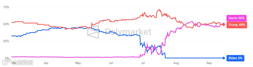 第二场的美国总统大选辩论于上周三由新闻媒体ABC News在费城举行,这是特朗普(Donald Trump)和贺锦丽(Kamala Harris)双方首次正面对决,备受瞩目。整场九十分钟的辩论中,双方就经济、俄乌战争、以哈冲突、堕胎、气候变迁、移民等议题进行攻防,不过具体政策内容相对缺乏。《纽约客》(The New Yorker)的评论员指出,不论是贺锦丽还是特朗普,都没有在这场辩论中进一步阐明执政方针,尤其是美国选民最关心的通胀和生活成本问题。而最终结果,根据CNN民调显示,63%的选民认为贺锦丽表现较佳。根据Polymarket网站显示,贺锦丽的胜选机率则达到50%,超过特朗普的49%(如图三)。