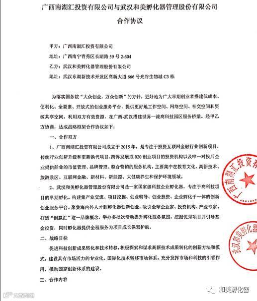 8月5日,武汉和美孵化器管理股份有限公司与广西南湖汇投资有限公司正式签约,建立战略合作关系.