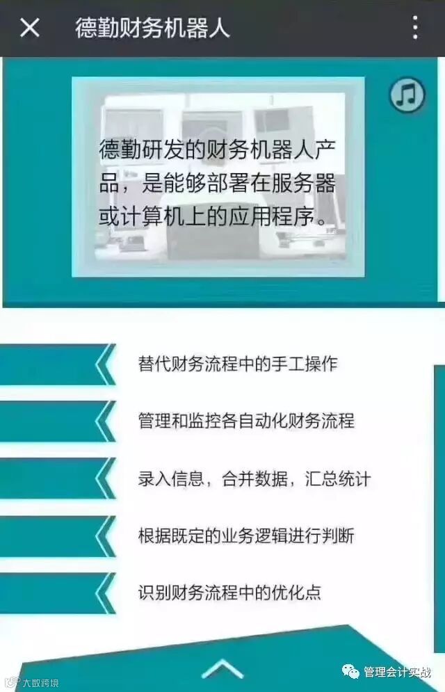 今年5月,德勤正式将人工智能引入财务工作中,打开了一个全新的时代。一个机器人可以顶替15个财务的工作,而且可以每周24小时*7日的工作。