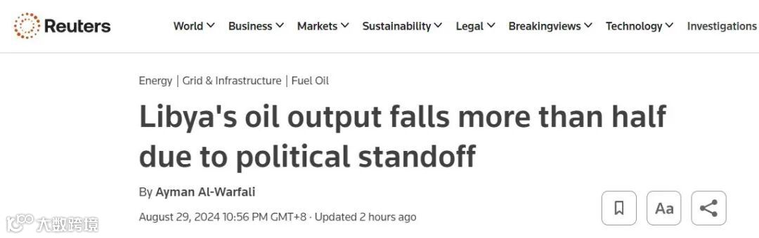 黄琛分析称,8月26日,利比亚东部政府在社交平台上发表声明称,所有油田码头和石油设施都面临“不可抗力”。但根据利比亚当地工程师8月29日的消息,位于利比亚oil crescent的港口运作正常,目前还没有接到停止出口的命令。这也说明利比亚并未全部停止出口,据市场估算,利比亚原油出口量可能降至40万桶/日,相较于正常水平减少约70万桶/日,小于此前市场预计的减产117万桶/日。