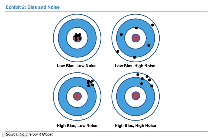用更形象的说法:噪声,是判断的分散,是互相之间都不一致;偏见,是系统性的错误,是都往一个方向偏。