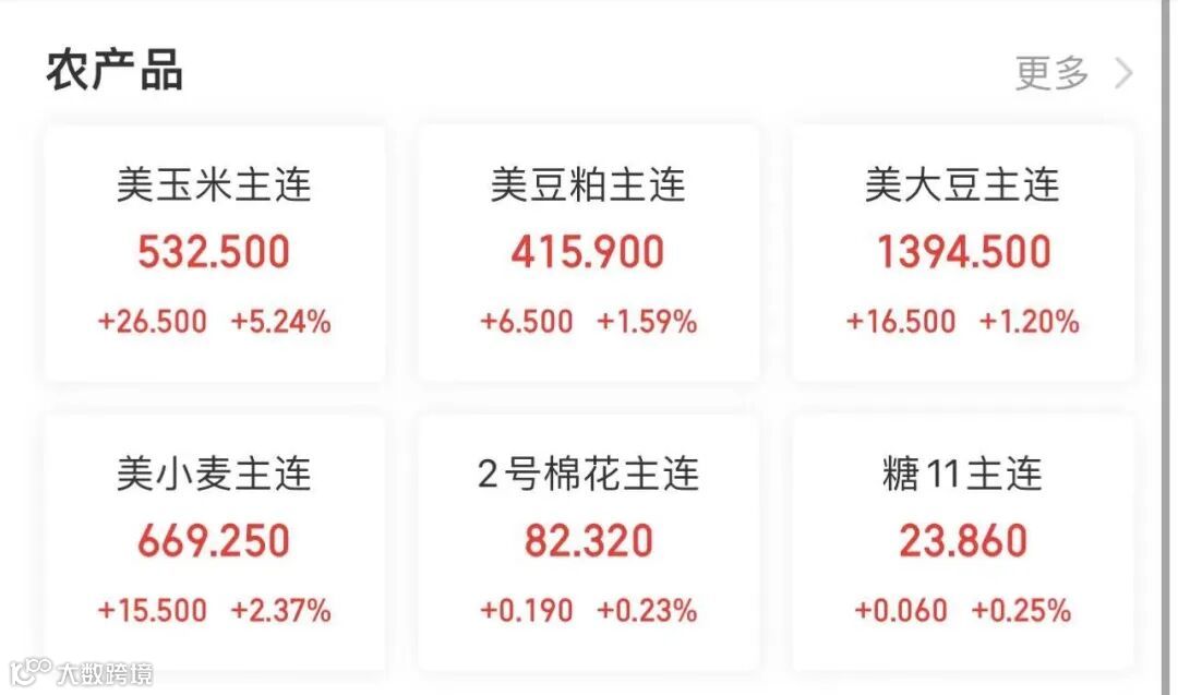 外盘农产品板块异动:今晨收盘,彭博谷物分类指数涨2.95%,报46.8126点,一度涨至日高47.1184点。CBOT玉米期货涨5.24%,报532.5美分/蒲式耳。CBOT小麦期货涨超2.25%,报669.25美分/蒲式耳。CBOT大豆期货涨1.25%,豆粕期货涨1.97%,豆油期货跌0.98%。ICE原糖期货涨0.25%,ICE白糖期货跌0.51%。ICE阿拉比卡咖啡期货涨0.48%,咖啡“C”期货涨0.06%。ICE棉花期货涨0.23%。
