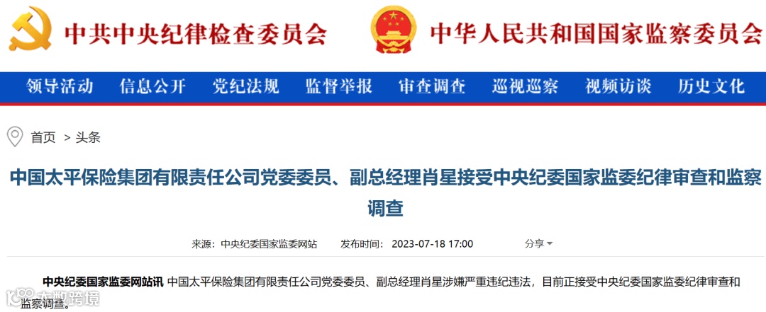 中央纪委国家监委网站显示,中国太平保险集团有限责任公司党委委员、副总经理肖星涉嫌严重违纪违法,目前正接受中央纪委国家监委纪律审查和监察调查。