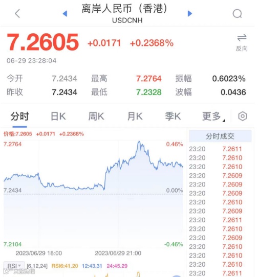 昨夜,离岸人民币兑美元失守7.27,为2021年11月以来新低。不过随后跌幅收窄。