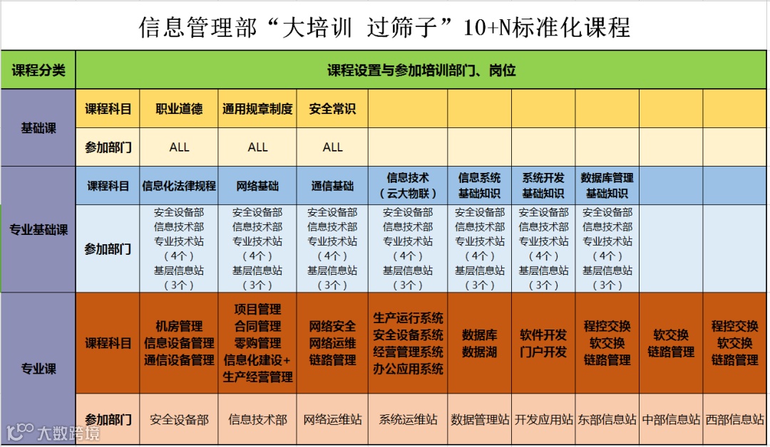 信息管理部以岗位职责为落脚点,研究制定了一套标准化培训体系。对信息、通信两大专业开发了“10+N”课程体系,包含17门课程。设置了以职业道德、规章制度、安全常识为内容的基础课;以信息化法律规程、基本网络与通信知识的专业基础课;以不同岗位需要掌握的专业技术和管理知识为内容的专业课,每个岗位都要通过“10+N”培训与考核,做到“干什么、学什么、补什么、考什么”的精准培训过筛。