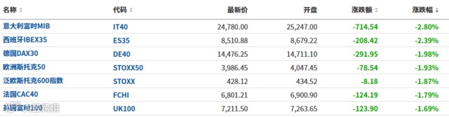 昨天下午,欧股低开后加速下挫,欧洲斯托克50指数跌近2%,意大利基准股指跌近3%,西班牙、德国、法国、英国股市跌幅均在2%左右。
