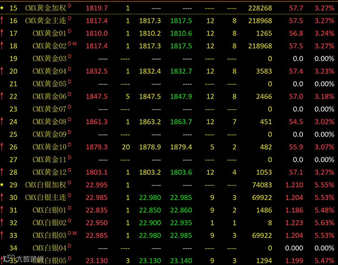受此影响,美元指数大跌,贵金属大涨。截至收盘,CMX白银收涨5.55%,CMX黄金收涨3.27%。