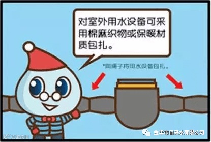 对暴露在外的水管、水龙头等用水设施,可用棉麻布等进行包扎保暖。室外水表井内的水表,要清除井内积水,确保其干燥,用旧棉衣、棉被等包裹,也可用砂子、锯末等填至水表铜盖边缘。